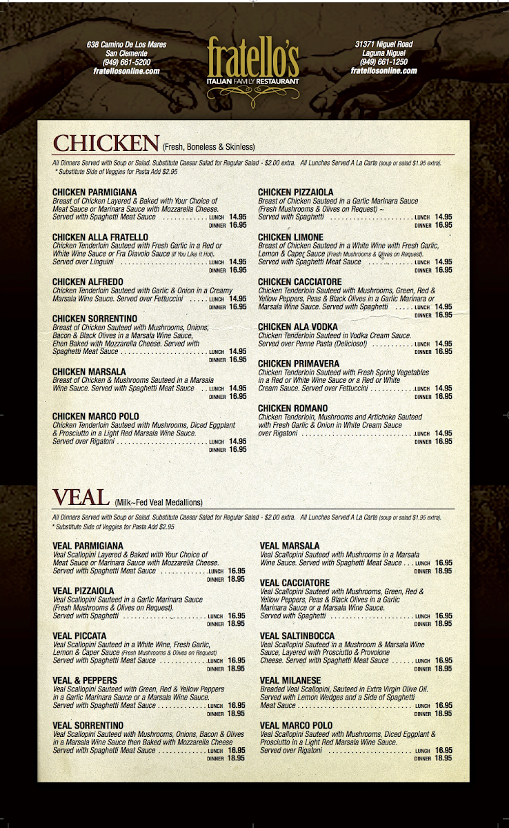 Fratello's specializes in traditional Italian cuisine, with a menu that showcases a beautiful selection of hearty dishes designed to evoke the warmth and flavors of Italy. Savor the rich, layered flavors of their Parmigiana, which features your choice of chicken or veal, baked to perfection and enveloped in a luscious meat sauce or marinara. Looking for something with a bit more sophistication? Try the Sorrentino, a delightful medley of mushrooms, black olives, and bacon in a Marsala wine sauce, all beautifully complemented by a side of spaghetti.